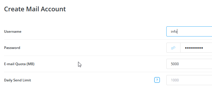 4. Masukkan detail seperti username, password, e-mail quota (MB). Email quota adalah limit 10GB untuk setiap email. Jika anda inginkan 10GB, masukkan 10,000. Kemudian klik butang Create Account