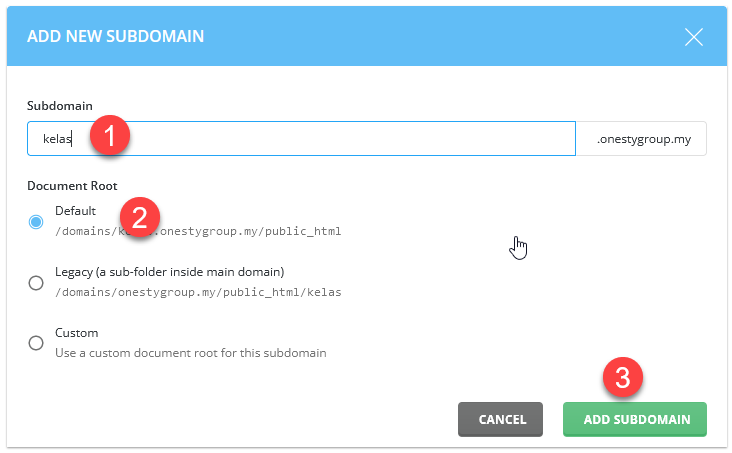 - Klik pada butang ADD SUBDOMAIN